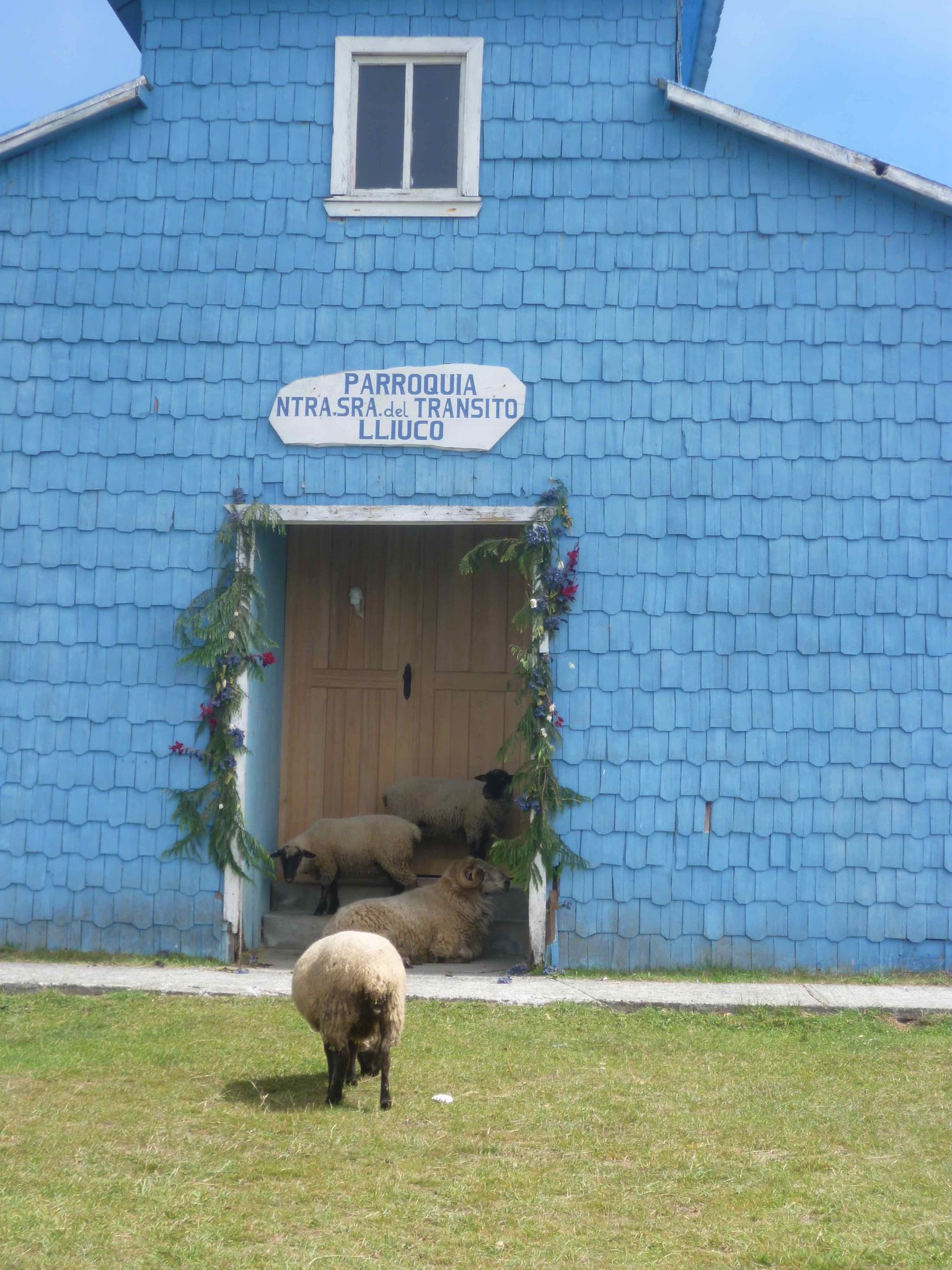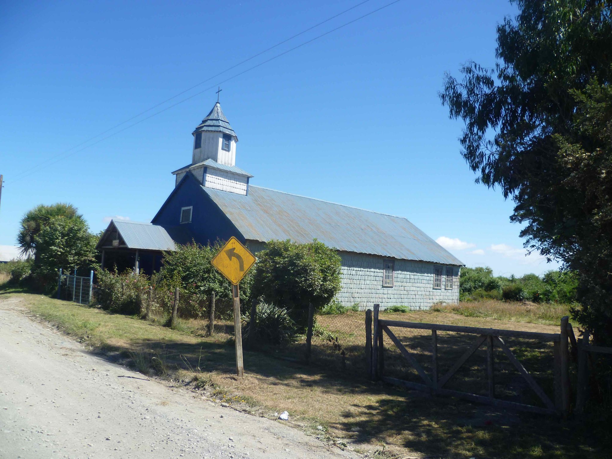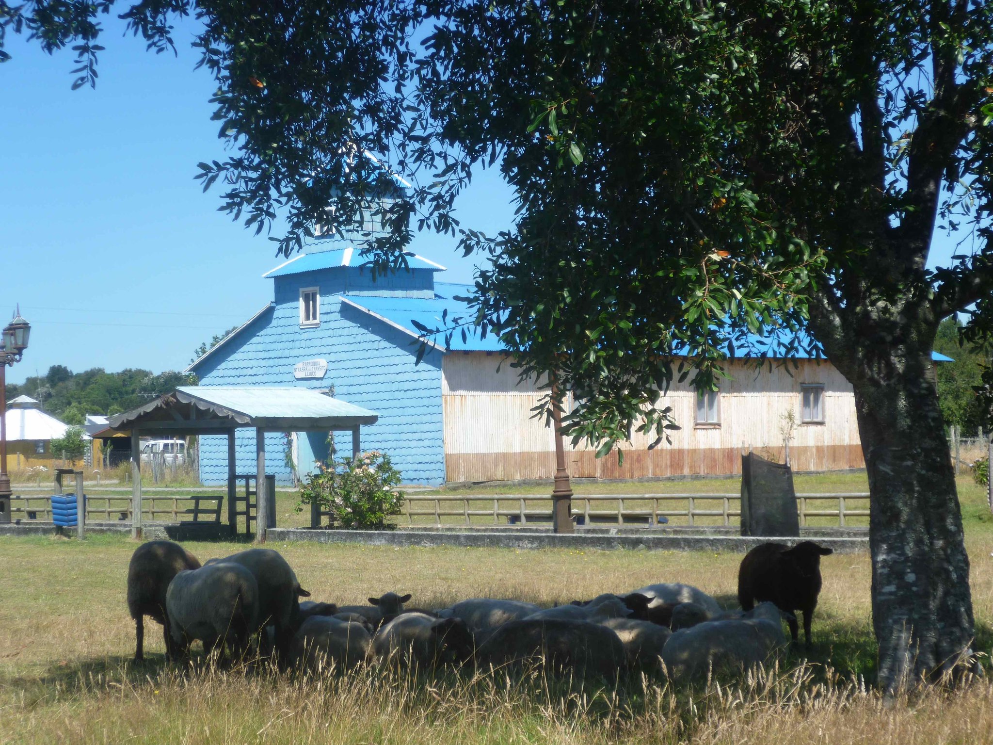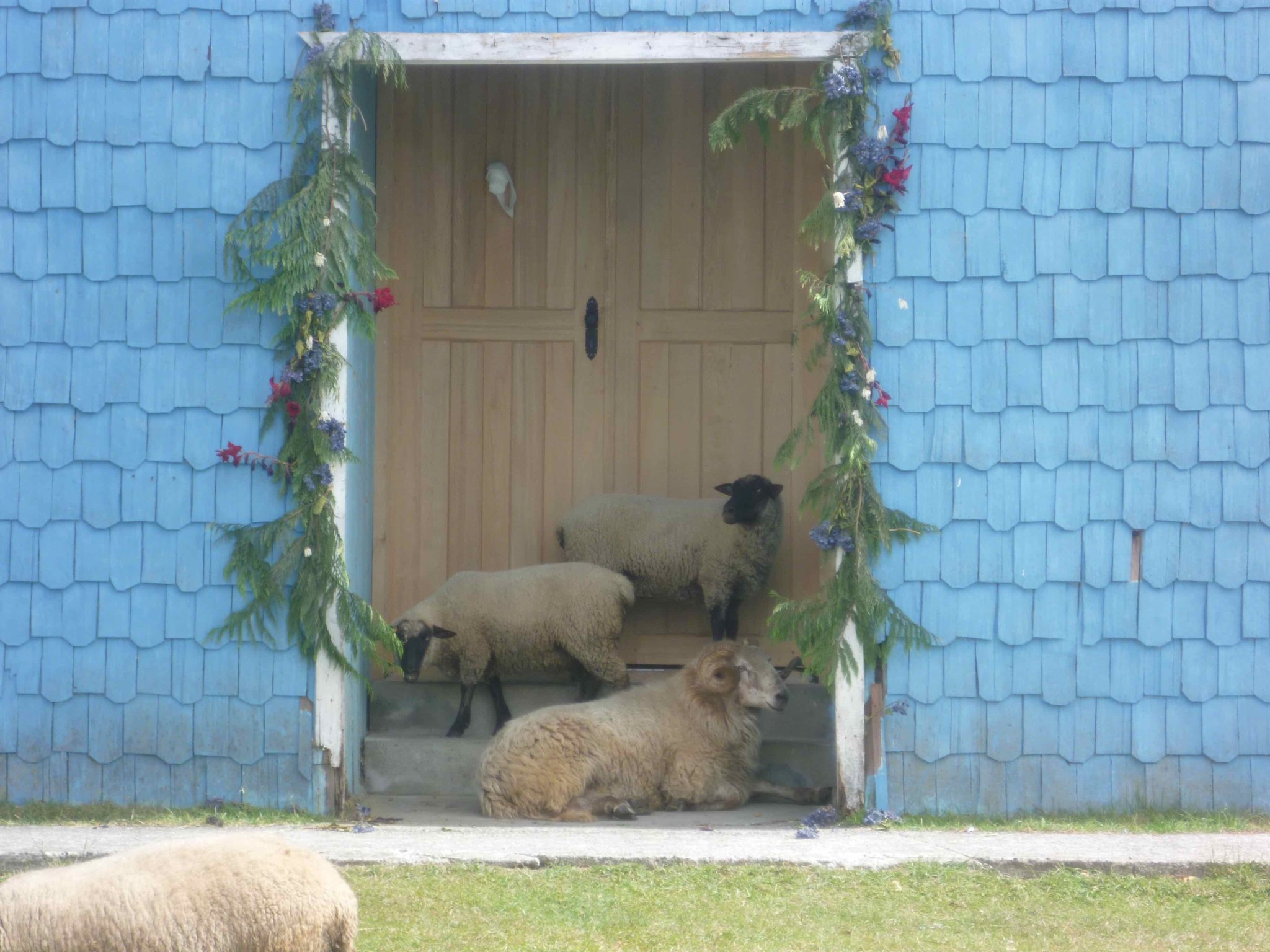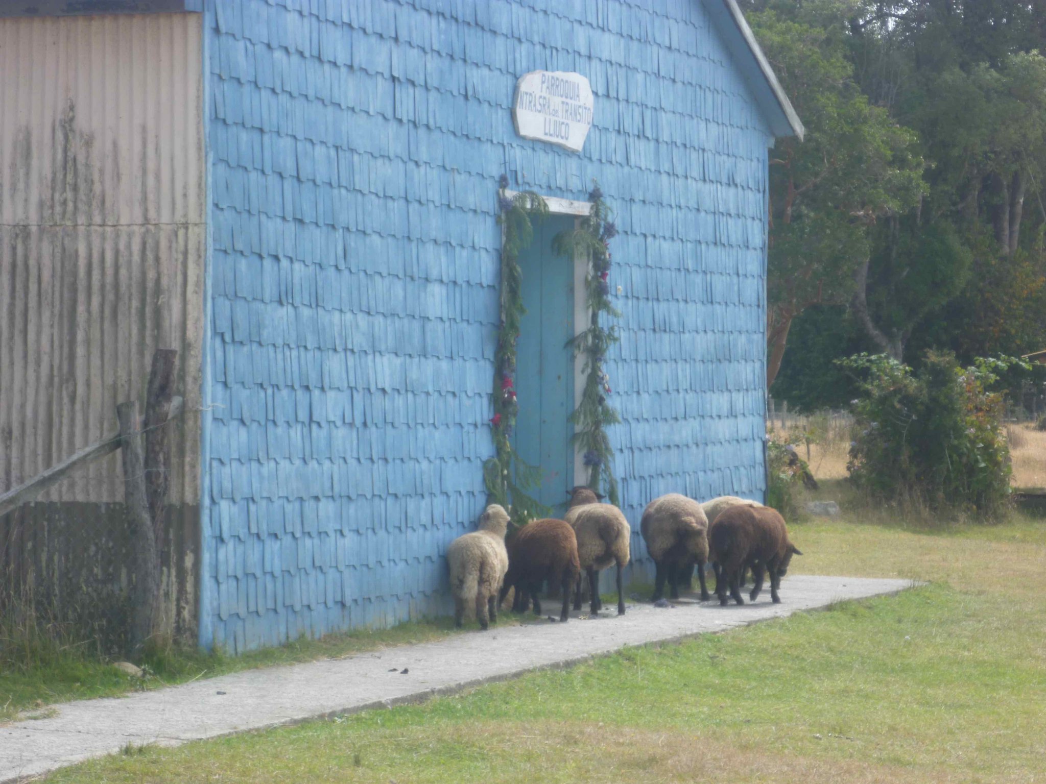 Heute geht es weiter auf der Insel Chiloe Richtung Süden. Am Wasser soll es bis nach Dalcahue gehen. Die Straße ist wieder Manfredos Abenteuer ! Eine Schotterstraße mit großen Löchern befahren wir und kommen durch kleine Dörfer, die uns das ländliche Chiloe zeigen.Die Menschen leben vom Fischfang. Das Sammeln von Algen ist ein guter Nebenverdienst. Sie werden getrocknet und als Gemüse in kleinen Paketen auf dem Markt verkauft. Auch als Dünger für die Felder oder als Viehfutter werden sie verwendet. An einem Friedhof haben wir Halt gemacht und auch deutsche Namen gefunden. Bei einer Mittagspause am Strand konnten wir auch entdecken, dass eine Kirche nicht nur den Menschen Schutz und Geborgenheit geben kann, sondern wir alle sind seine Schäfchen - auch die echten Schafe.